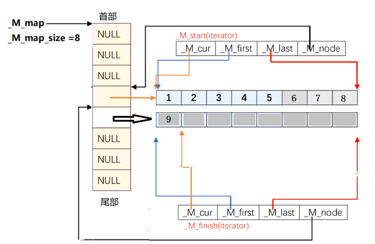 - 然后,将新元素插入到新块的开头,并更新 _M_finish 迭代器的 _M_node 和 _M_cur 指针。