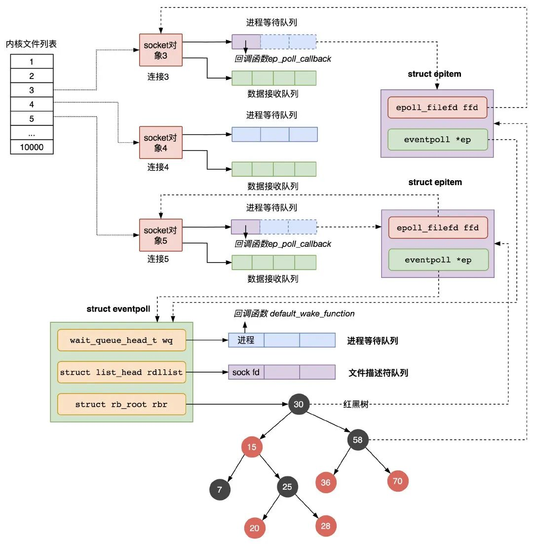 - 当eventpoll监控的连接上有数据到达时:- socket的数据接收队列有数据到达,会通过进程等待队列的回调函数唤醒红黑树中的节点epitem;