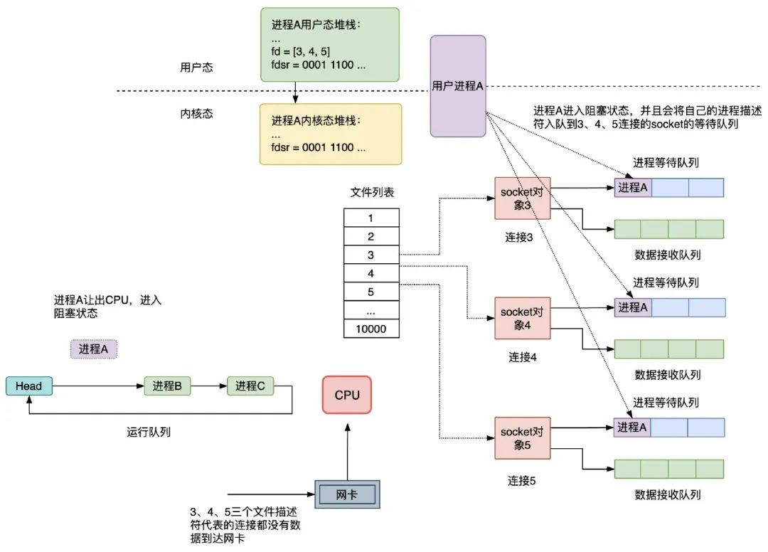 - 进入阻塞状态后,内核会遍历传入 fd_set中的每一个fd,对于每个fd都会关联一个等待队列,然后将当前调用select()的进程添加到该等待队列中。(可能会有多个进程调用select(),一个fd的等待队列可能包含多个进程)