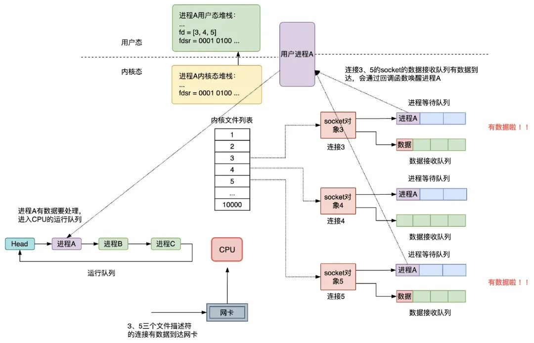 - 将一个数据到达时用到的回调函数添加到socket的进程等待队列中,注意,进程是放在eventpoll的等待队列中,等待被``epoll_wait函数唤醒,而不是放在socket`的进程等待队列中;