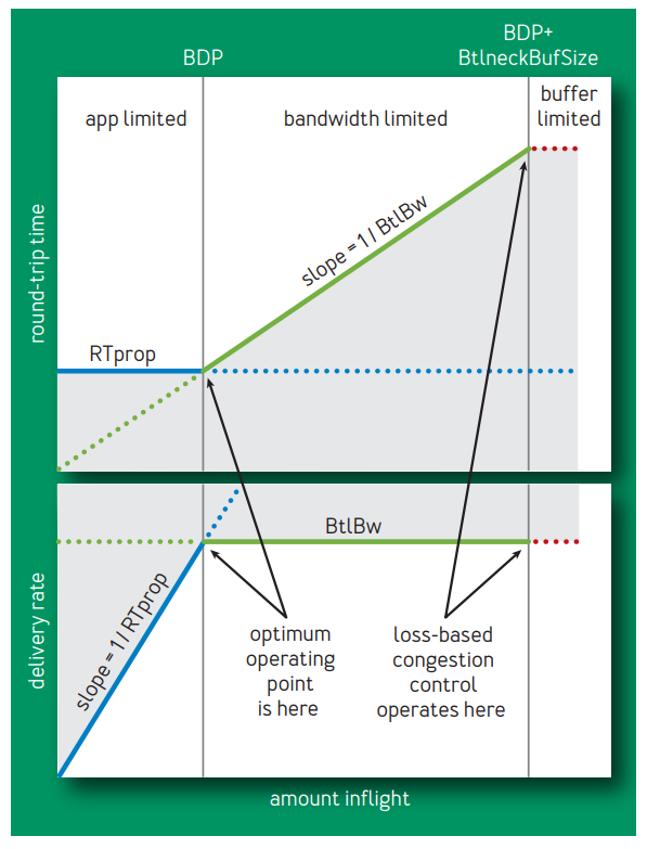 \[BDP=BtlBw×RTprop\]BDP代表了为了恰好填满整个网络管道,同时又不在路由器中产生额外排队,发送方需要发出的数据量。