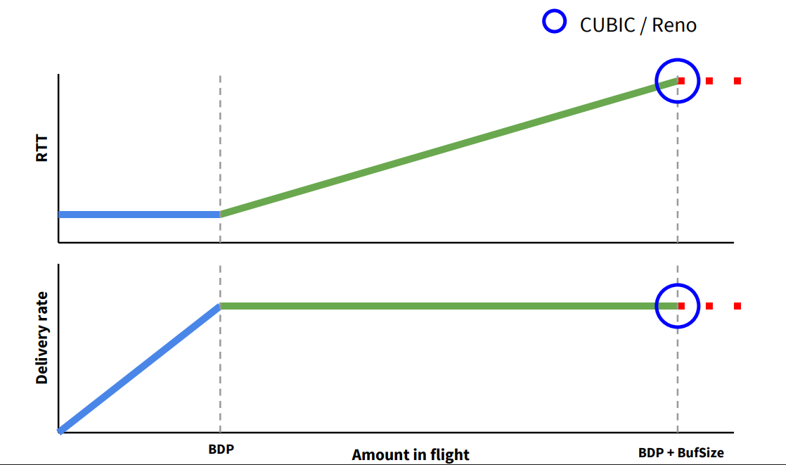 - $ RTT = RTprop + Queuing Delay = RTprop + \frac{Inflight - BDP}{BtlBw} $ RTT会随着Inflight data的增加而线性增长。