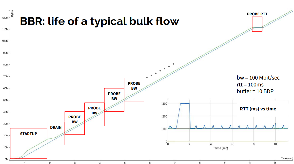 - 目标: 在大部分时间内以接近瓶颈带宽的速率稳定发送,同时周期性地探测是否存在更大的可用带宽。