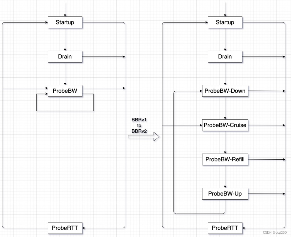 BBRv2对启动阶段做了优化,使其在初始带宽探测时能更快地收敛,同时减少了在启动末期造成的排队溢出。
